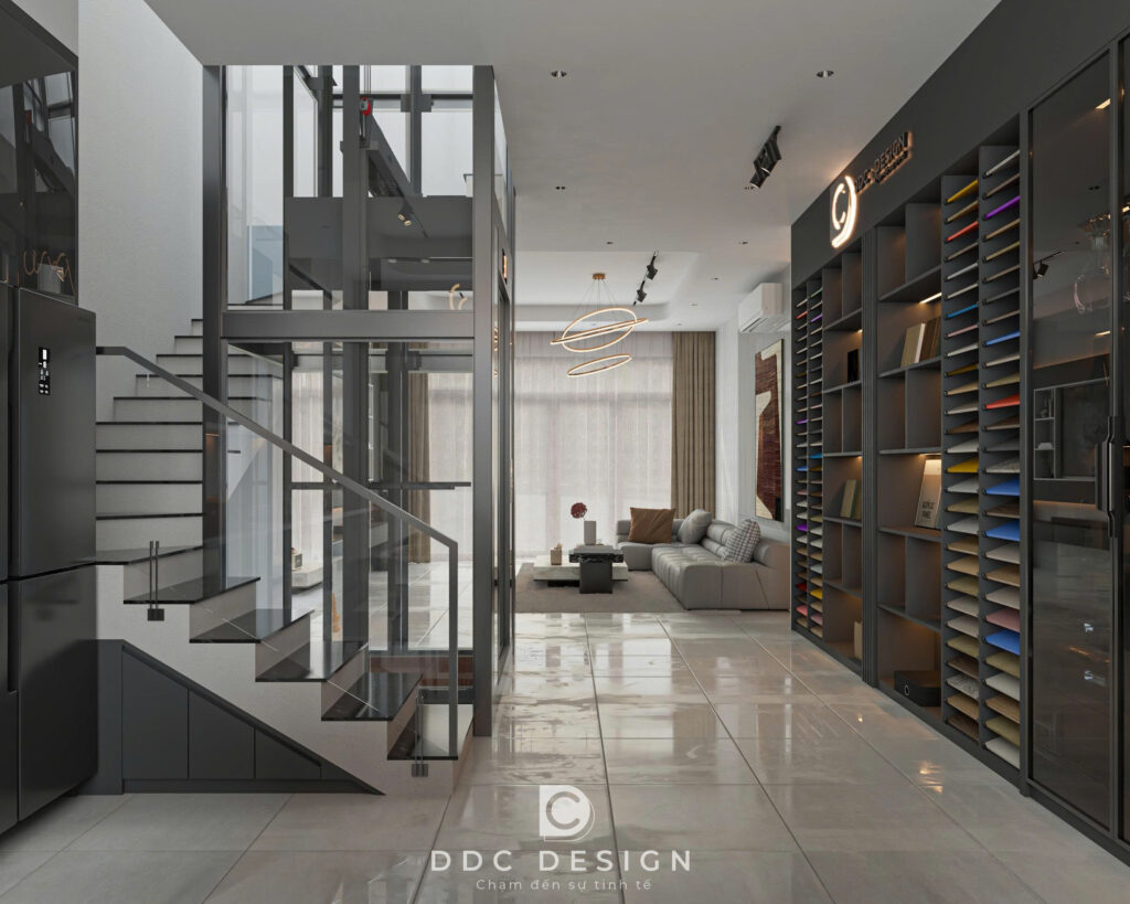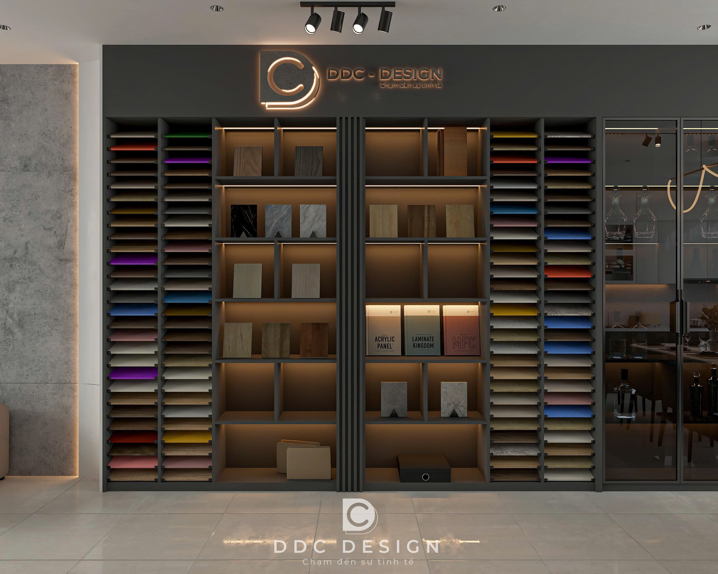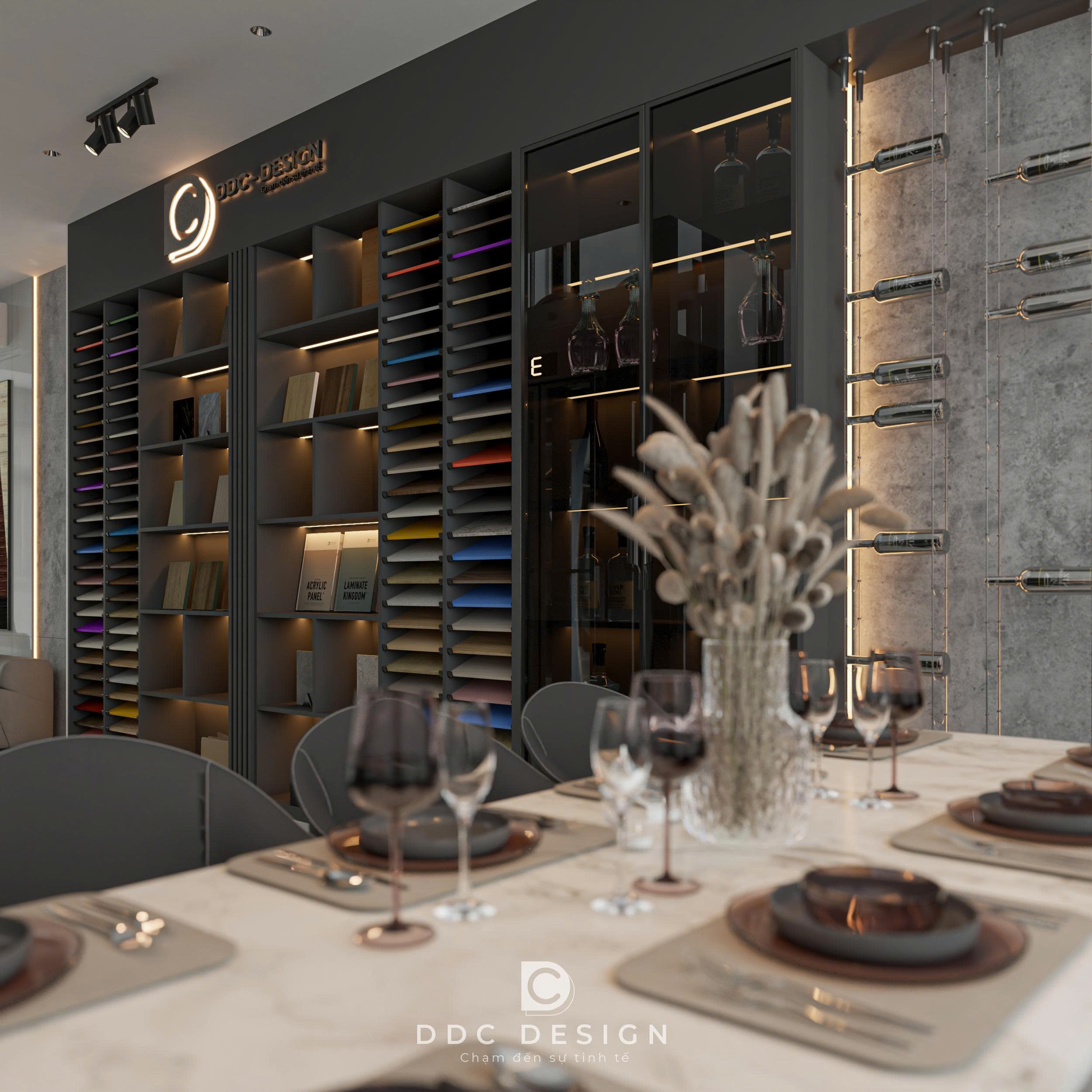 ✅ Hệ tủ kịch trần đa công năng: Thiết kế độc bản kết hợp giữa thư viện vật liệu, tủ trưng bày rượu và kệ trang trí. Nơi DDC Design có thể tự hào giới thiệu về gu thẩm mỹ tinh tế của mình.