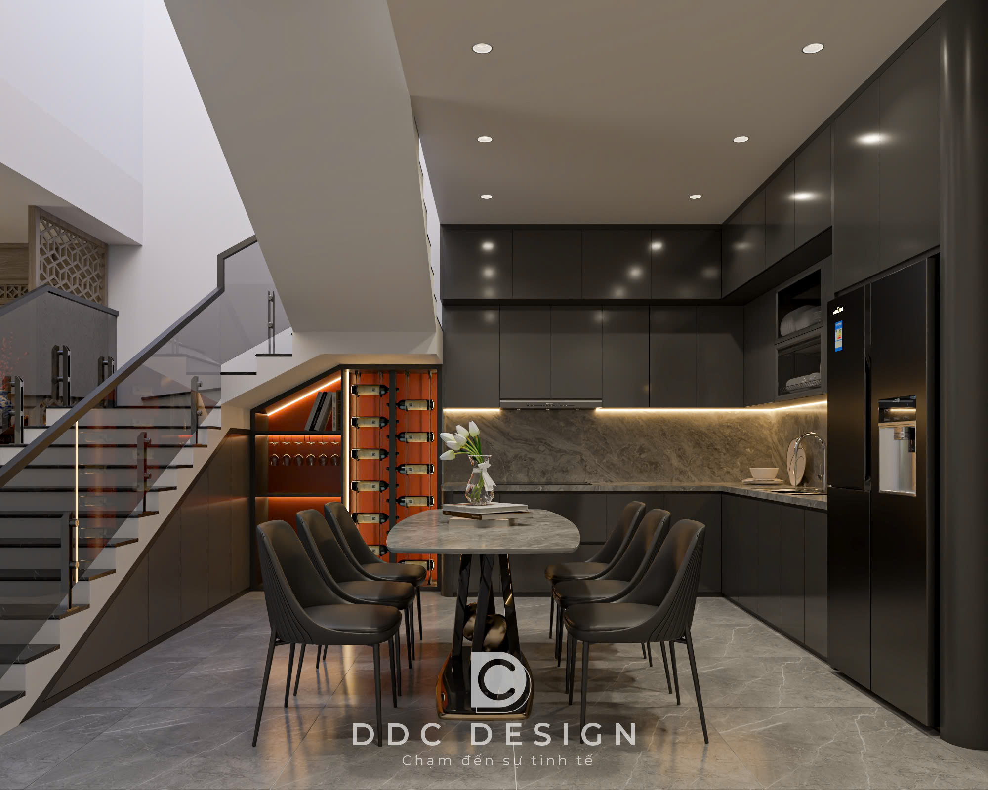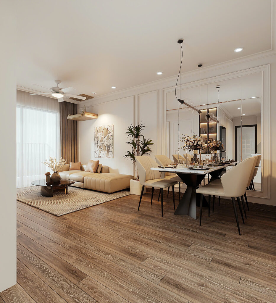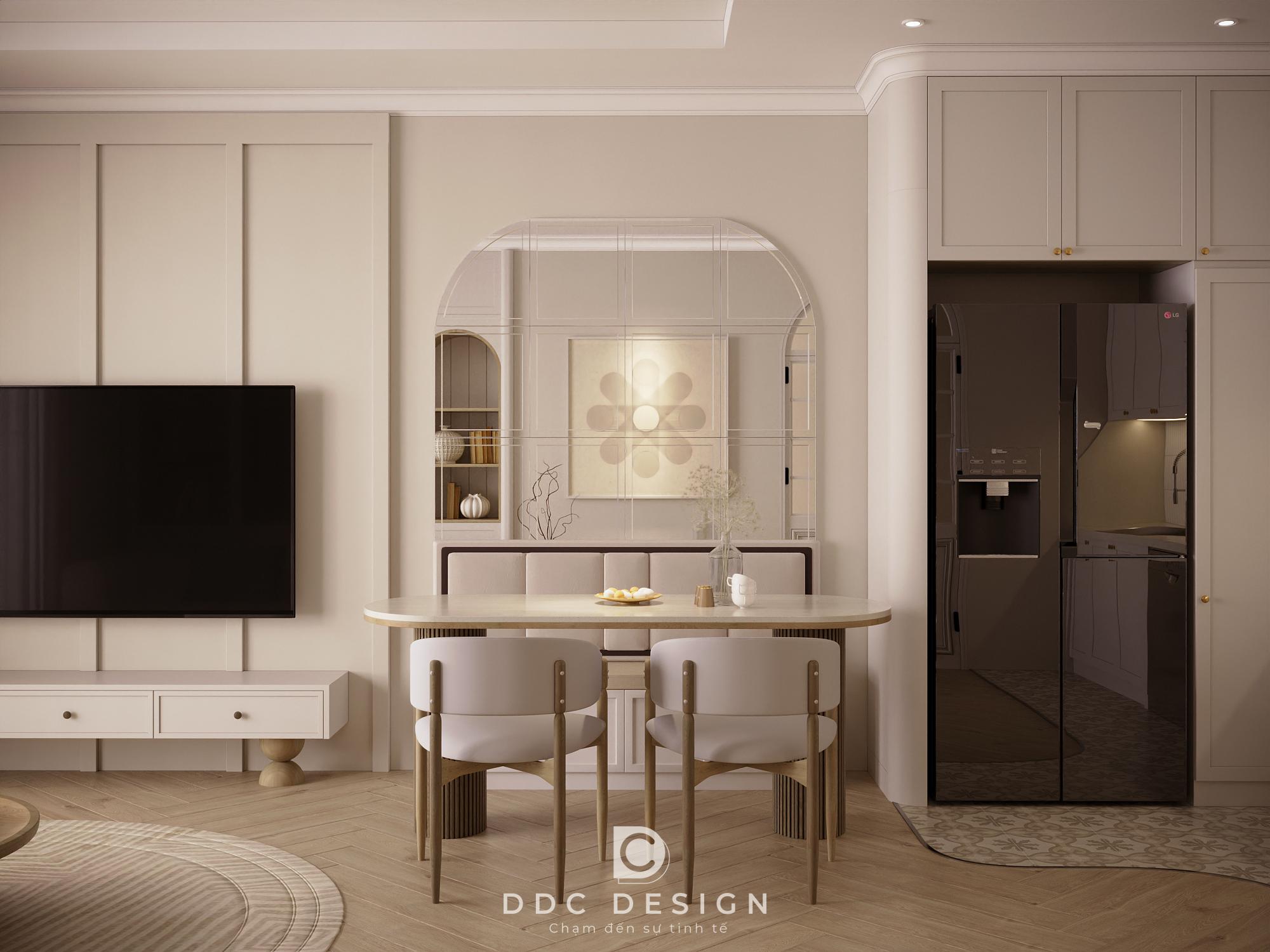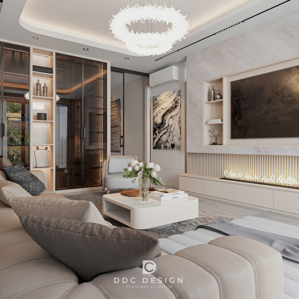 DDC Design đã sử dụng thủ pháp: Phân chia không gian mở: Kết nối phòng khách – bếp – phòng ăn tạo thành một đại sảnh sang trọng.